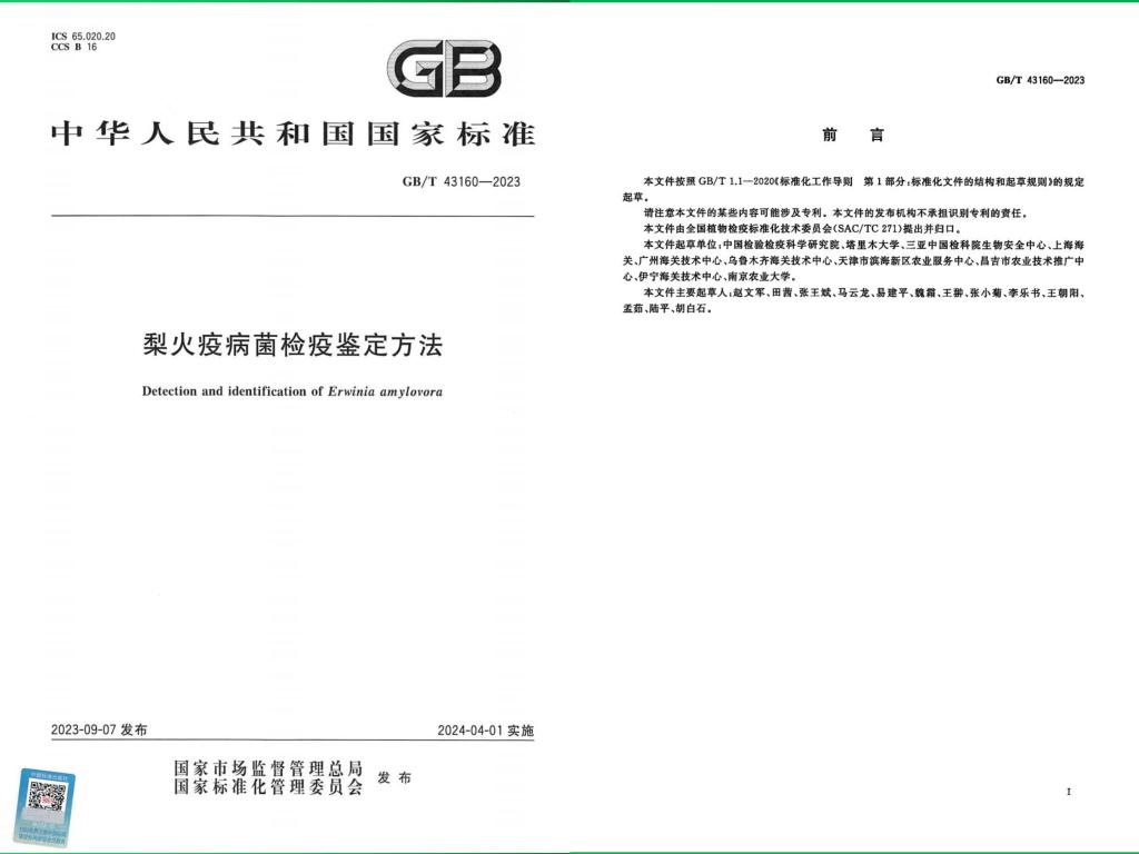 2023年9月7日,国家市场监督管理总局(国家标准化管理委员会)批准了《梨火疫病菌检疫鉴定方法》国家标准(标准号GB/T 43160-2023),标准于2024年4月1日实施。公司zoty中欧张王斌教授是该标准的主要起草人,此标准依托张王斌教授主持的兵团重点领域科技攻关计划项目《南疆枝枯病动态监测及防控关键技术集成研究》(2018AB038)部分研究成果。