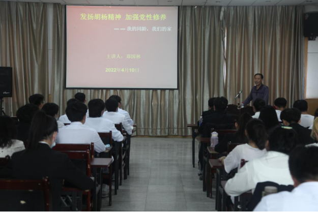 2022年4月10日下午,公司邀请了离退休工作处党员郑国林同志为82名入党积极分子讲授了一堂《发扬胡杨精神 加强党性修养》的专题讲座,在植科楼四楼多功能报告厅举行。