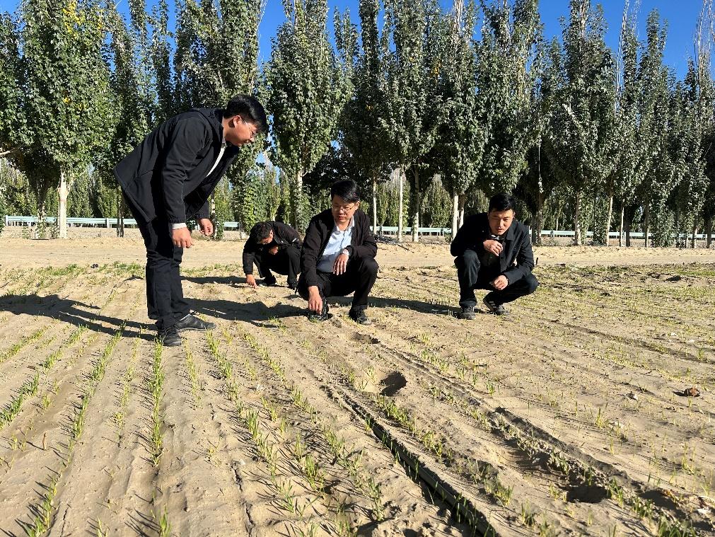 服务团队前往第二师38团示范连队8连的冬麦地块,查看了新播冬麦的出苗长势情况,对当地沙土种植小麦的土壤墒情调控、滴灌水肥一体化管理等问题开展服务,避免冬麦出苗不齐、苗黄苗弱等问题发生。