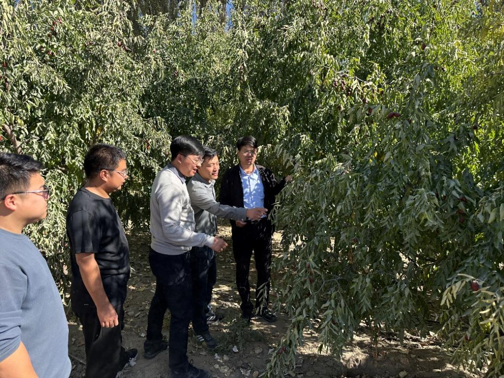 服务团队在38团1连枣园具体了解了红枣挂果、品质糖度等情况。38团位于塔克拉玛干沙漠南缘,温差大、日照时间长,红枣品质整体较好,但今年挂果率不高,团队人员就红枣采收及下年提高枣树挂果、科学灌水施肥等增产措施提出建议。