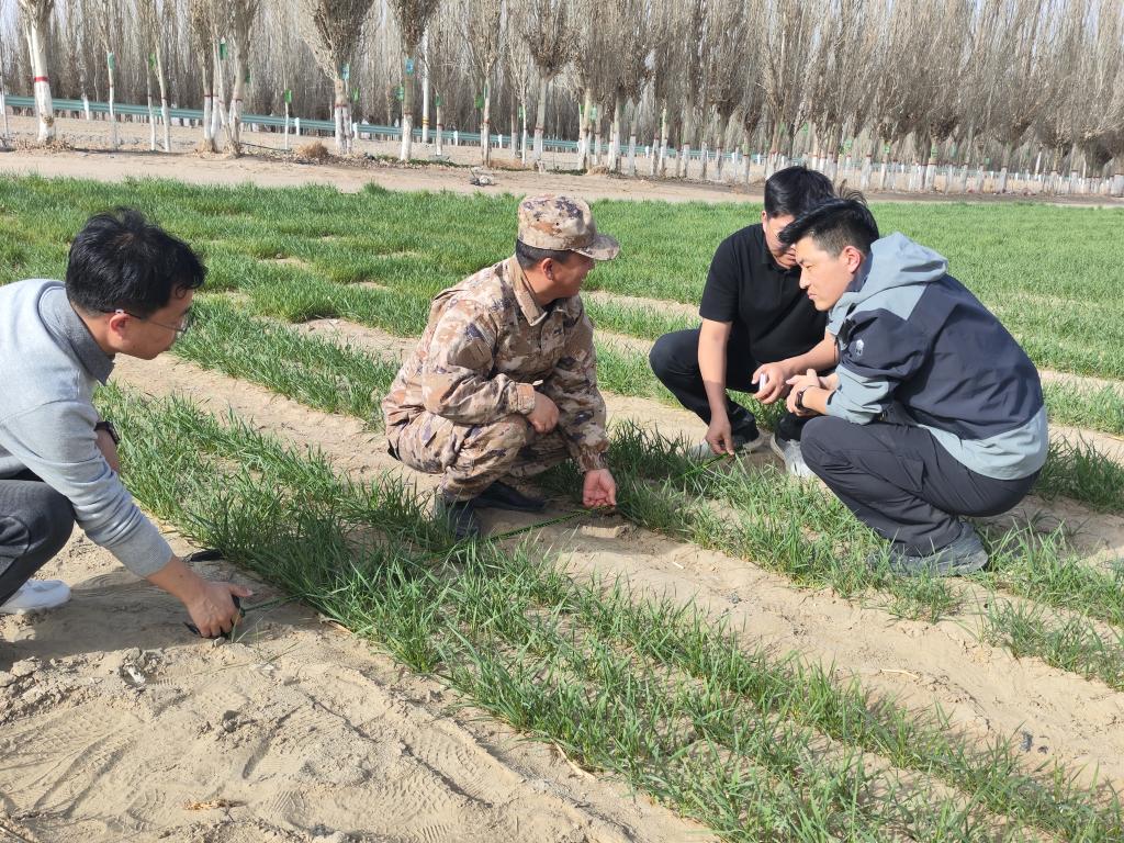 深入冬麦返青地块,指导交流了“冬麦+玉米宽窄行套种”新栽种模式,对小麦返青期间水肥管理、后期玉米适时播种进行了指导。同时查看了孜然出苗情况,团队成员对孜然苗情进行了诊断,建议针对孜然出苗不均匀的部分地块,可进行补种,加强田管、保墒控水,促进孜然健壮生长。