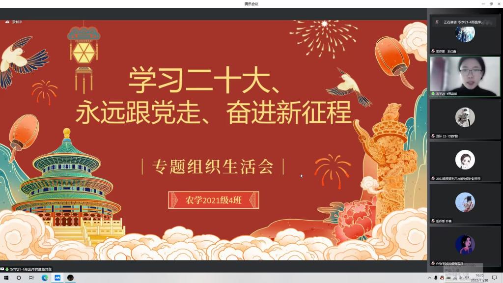 为规范指导专题组织生活会流程,强化示范带动作用,12月7日下午,学院团委在线上组织开展了“学习二十大、永远跟党走、奋进新征程”专题组织生活会观摩学习活动,示范团支部为农学2021级4班团支部,团委副书记王婷婷老师,全体团支部书记参加本次活动。