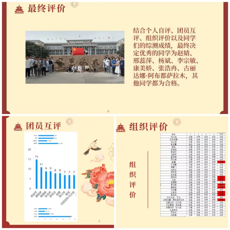会议伊始,全体参会人员齐唱中国共产主义青年团团歌。农学2021级4班团支书邢蕊萍带领班级团员重温了党的二十大报告金句,结合答题小游戏,调动了参会团员的积极性。邢蕊萍就团支部前期团史学习和党的二十大精神专题学习情况进行总结汇报,团支部委员及三个团小组组长在会上分别展开了批评与自我批评。随后邢蕊萍就班级团员评议的方案与流程进行了详细讲解,根据团员互评和组织评议的结果,最终八名团员被评议为优秀,得到了班级的一致认可,也为其他班级开展团员评议提供了参考方案。