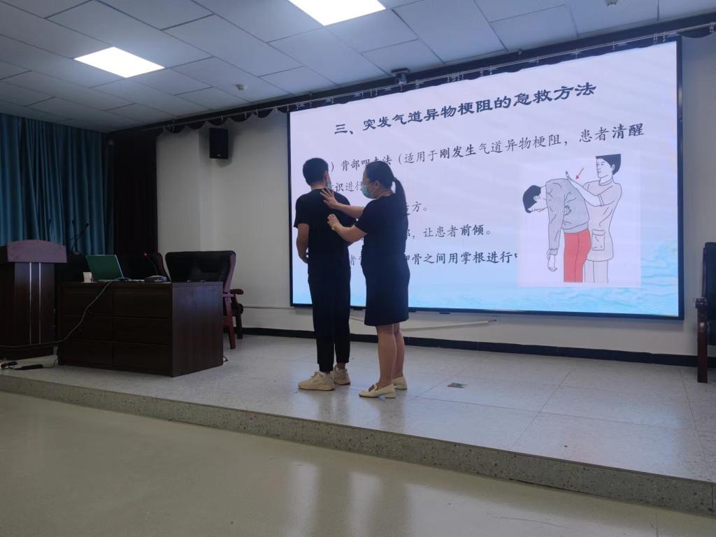 活动伊始,闫医生简要介绍了急救的意义及相关环节,让大家对于应急救援有了初步认识。她阐明了应急救援的步骤与具体操作,包括气道异物梗塞、运动损伤和动物咬伤这三个常见的急救情况。此外,她还现场为同学们演示了气道异物梗塞的急救流程,同学们热情高涨,积极主动,纷纷上场进行演练。理论与实践相结合的教学模式也让整场活动变得生动、活泼、有趣,培训效果良好,现场气氛热烈。