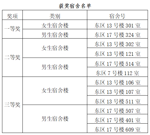 本次评比活动分初赛和决赛,初赛环节共有206间宿舍参与,根据卫生评比情况,最终12间宿舍进入决赛。决赛环节,评委根据卫生评比结果 、PPT汇报情况及才艺表演三个方面进行评比,最终评出一等奖两个、二等奖四个、三等奖六个。