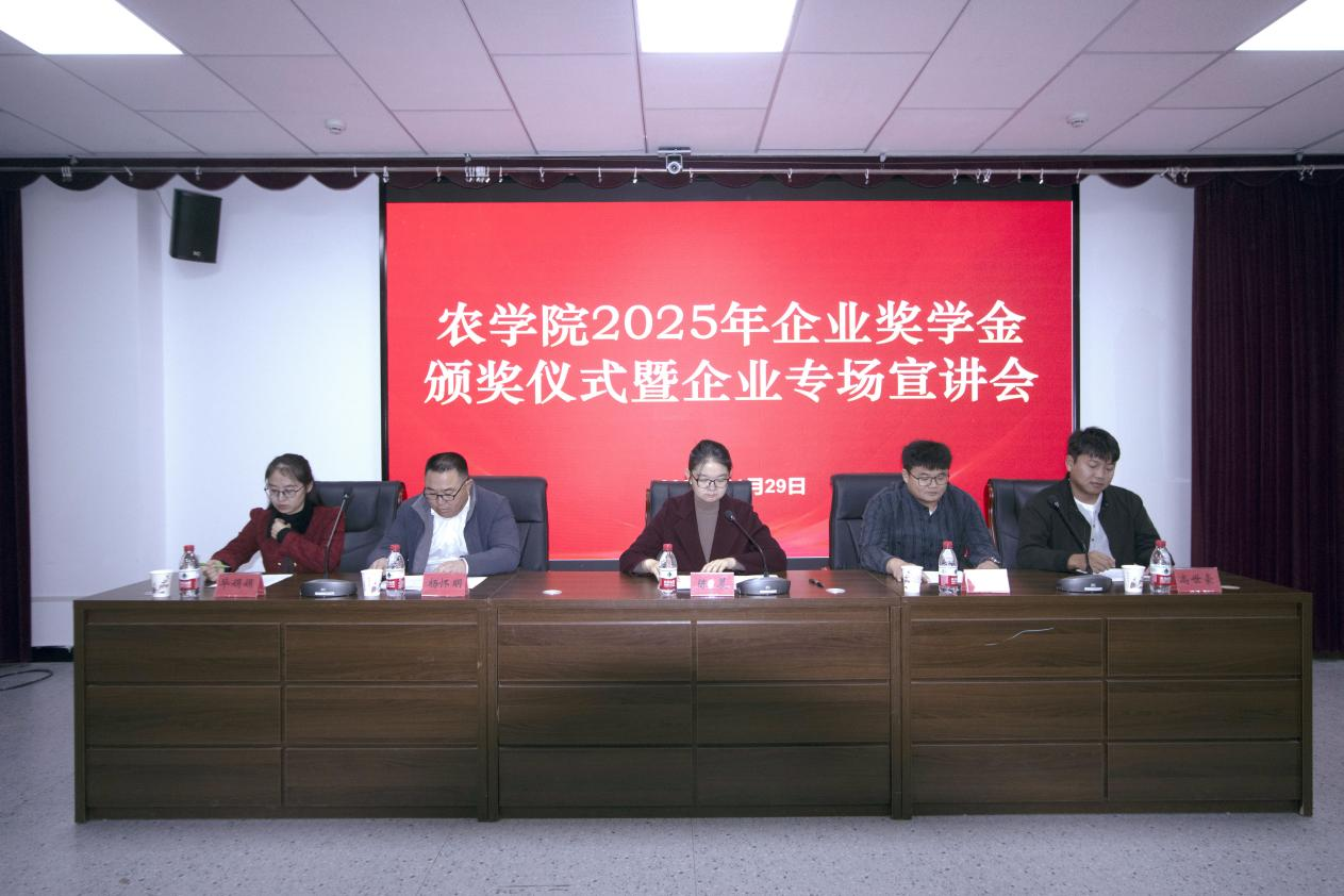 2025年11月29日下午,公司在农科楼225会议室举办2025年企业奖学金颁奖仪式。本次活动以“筑梦启航,‘职’引未来”为主题,旨在表彰在实习与就业中表现优异的学子,深化校企合作,共育新时代农业人才。四家合作企业代表、公司党委副书记、纪委书记陈晨、系主任、辅导员和员工代表共同参与此次活动。