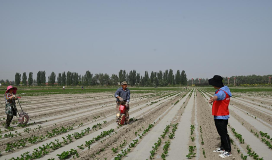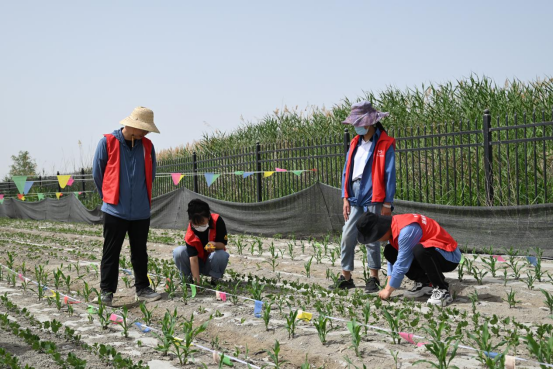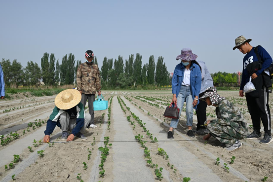 赵书珍老师指导员工对大豆的出苗率进行了调查,开展了生动的田间课堂